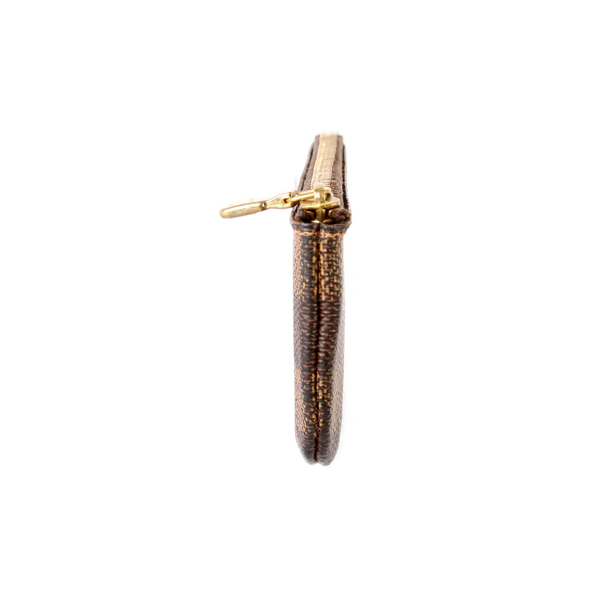 This pre-owned Louis Vuitton Pochette Cles is guaranteed 100% authentic. The exterior is in the classic Louis Vuitton Damier Ebene coated canvas.