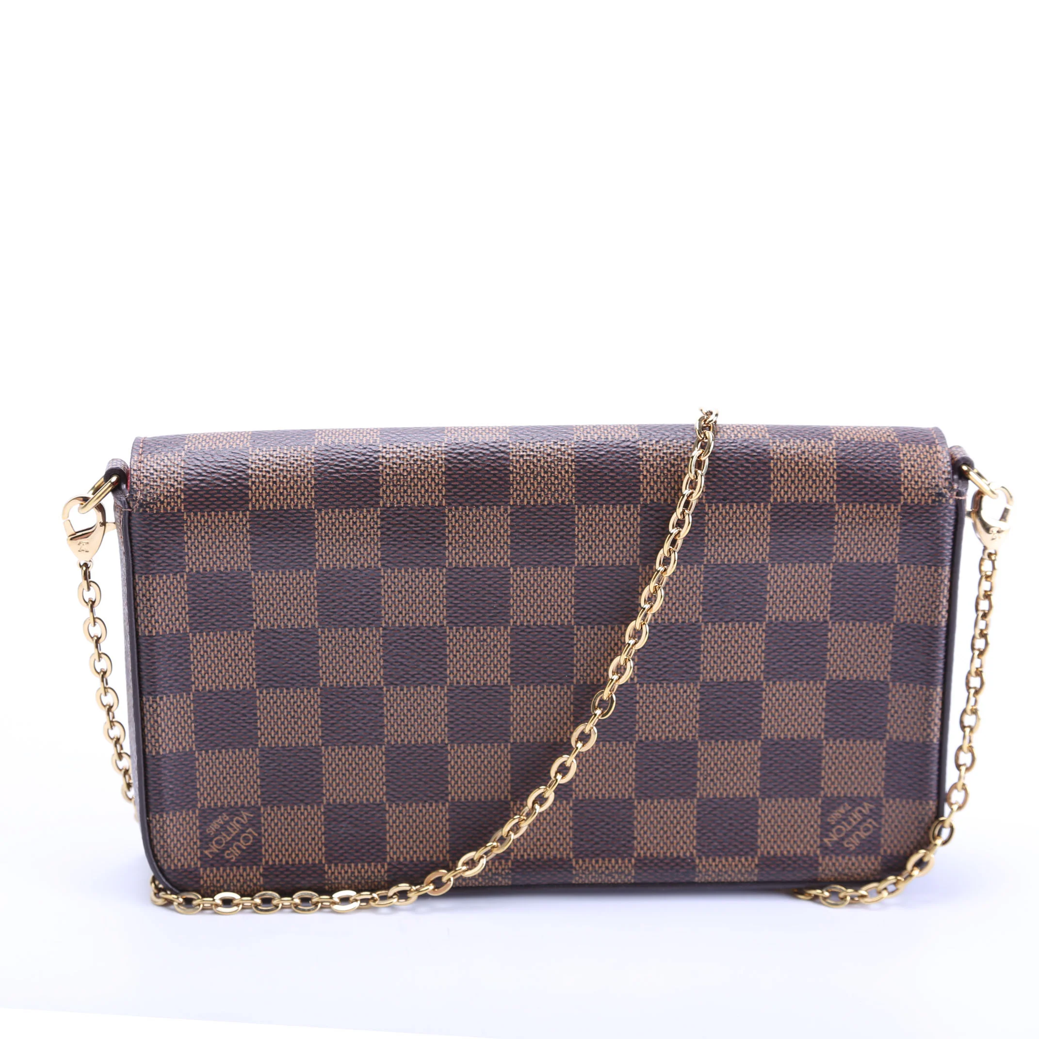 This pre-owned Louis Vuitton Pochette Felicie is guaranteed 100% authentic. The exterior is in the classic Louis Vuitton Damier Ebene coated canvas.