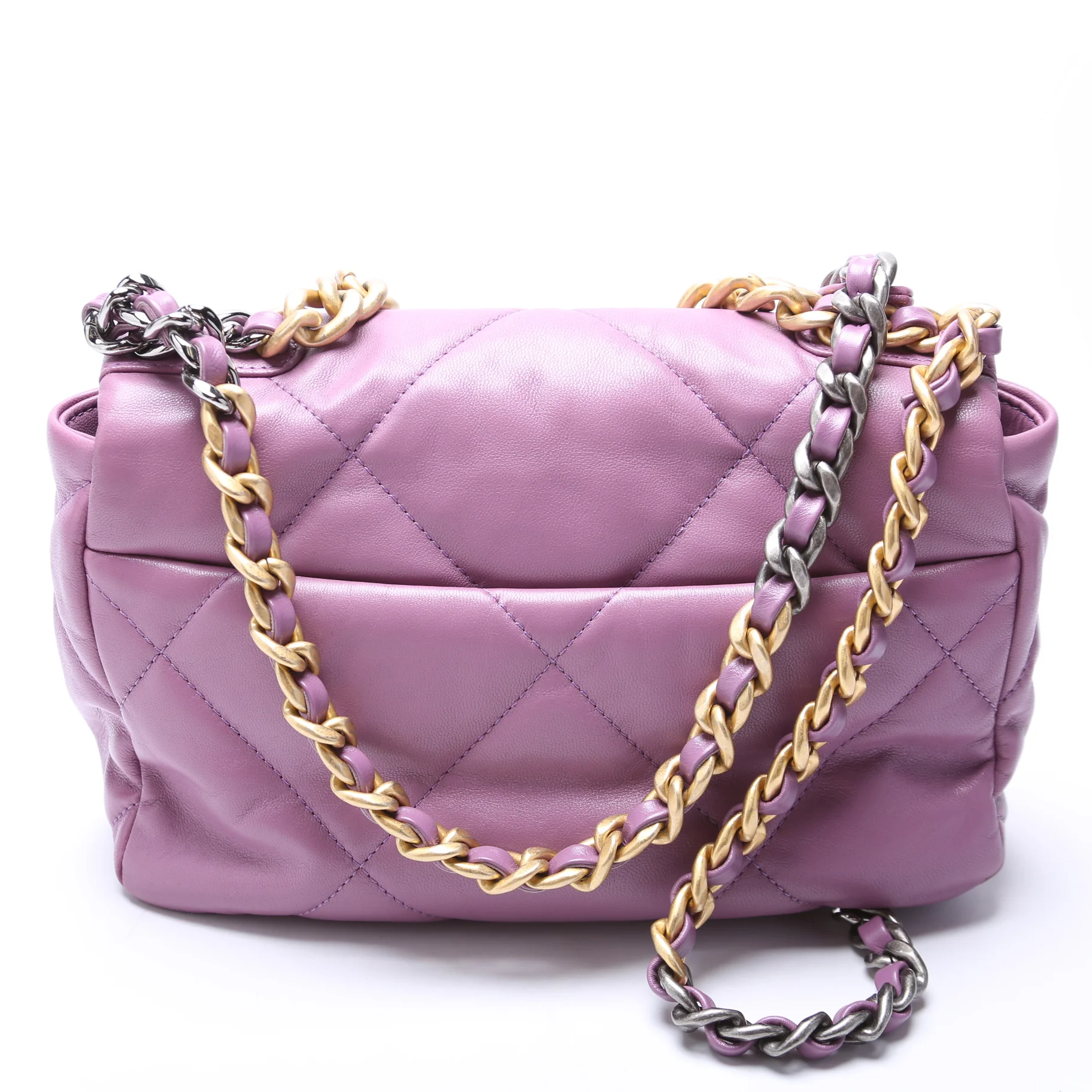 This pre-owned Chanel 19 Medium Flap is guaranteed 100% authentic. The exterior is in the classic Chanel Quilted Goatskin leather.